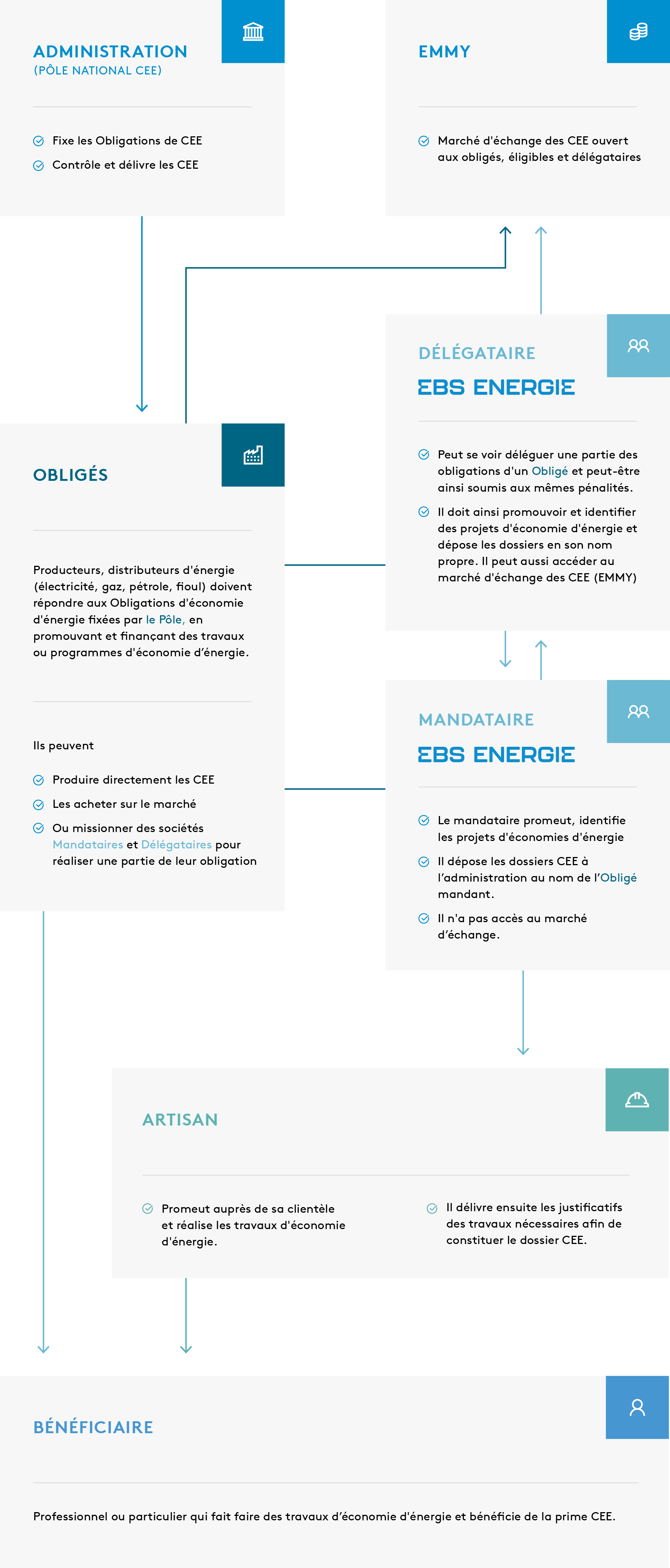 Nous sommes délégataires, accrédités par l’Etat. Nous gérons tout ou partie des obligations des vendeurs et distributeurs d’énergie. Nous endossons le rôle, mais aussi les responsabilités des obligés. A ce titre, nous valorisons des opérations d’économies d’énergie auprès des bénéficiaires.